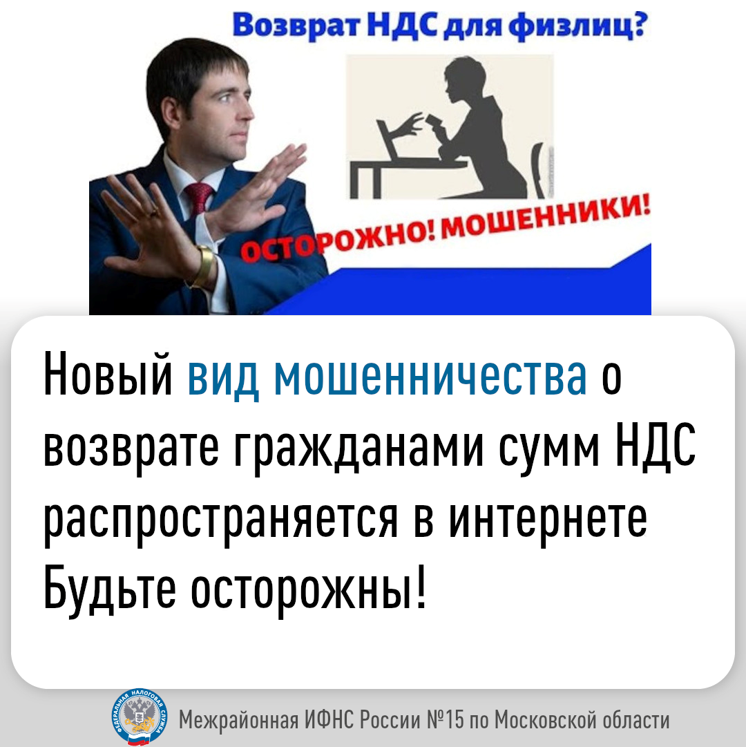 На фоне оказания государством поддержки бизнесу и гражданам активизировались мошенники, предлагающие гражданам вернуть НДС за приобретенные товары. Информация распространяется в видеороликах и через рассылку на электронную почту и в мессенджеры.